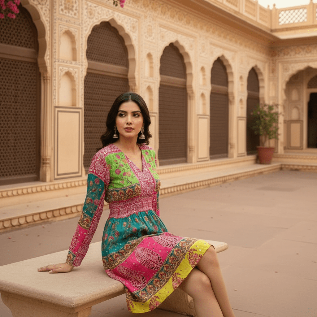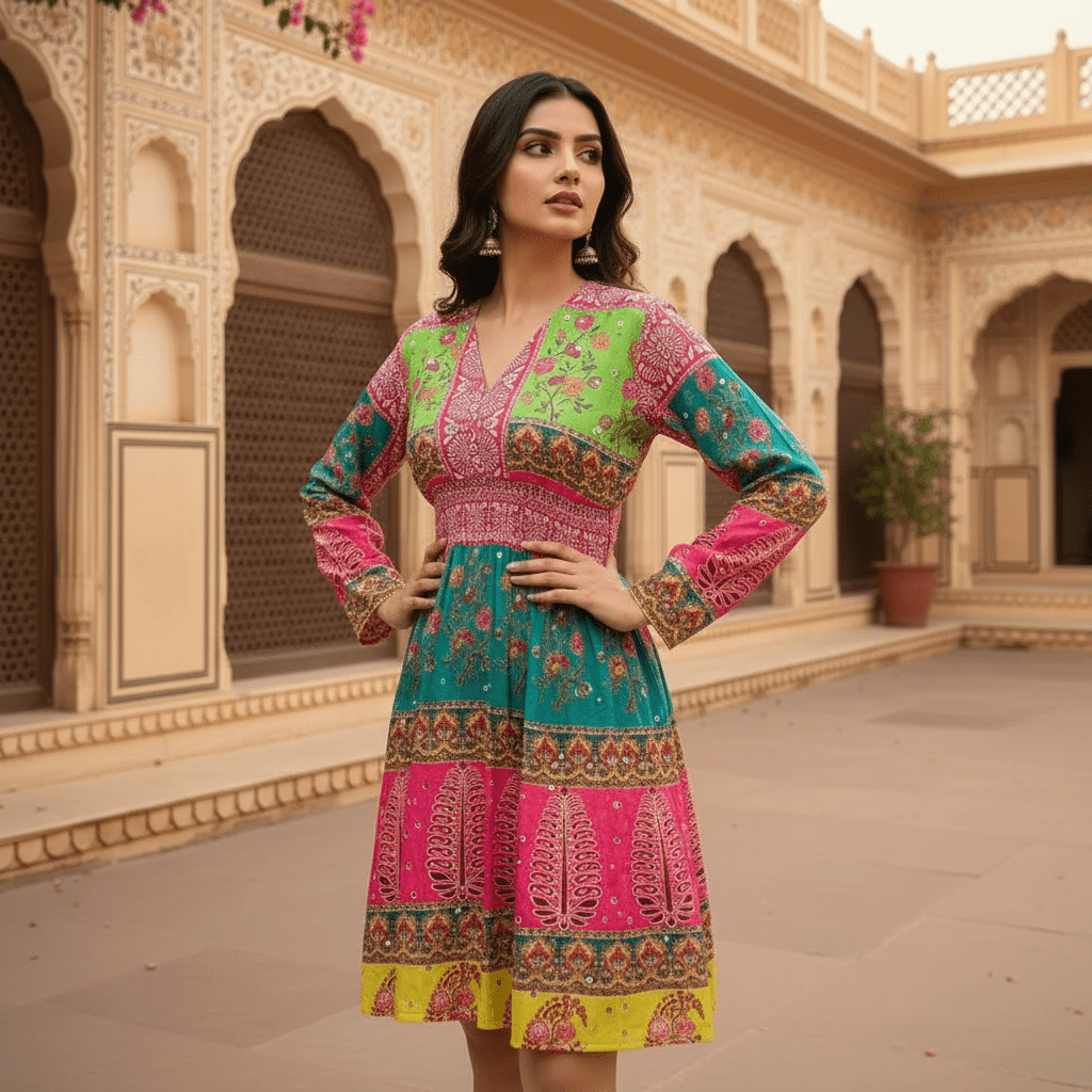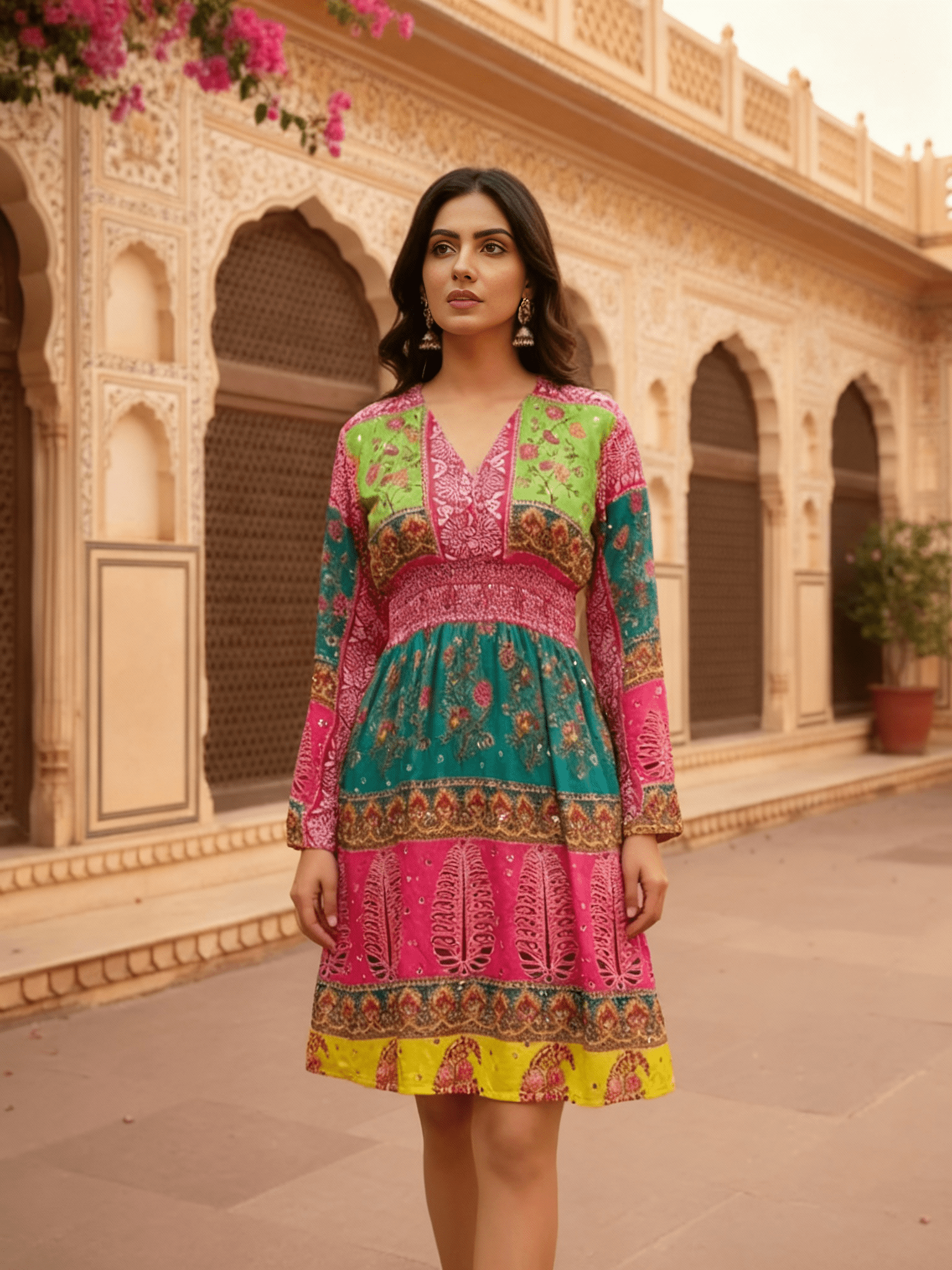 Elevate your everyday style with this Bohemian Bandhani Printed Short Dress, blending tradition with a modern silhouette. Designed in rich shades of pink, green, and yellow, this dress showcases intricate ethnic-inspired prints. The fitted bodice with gathered waistline flatters your shape, while the flowy skirt and long sleeves add grace and comfort. Perfect for brunches, festive get-togethers, or casual outings, this dress is a must-have for those who love fusion fashion with a cultural twist.