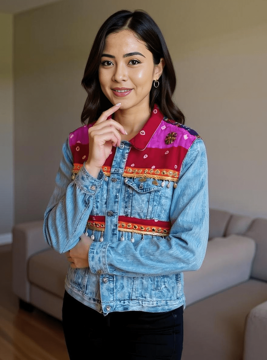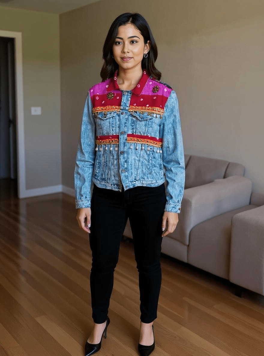 Turn heads with this unique handmade patchwork denim jacket—a stunning fusion of classic denim and vibrant ethnic detailing. Featuring rich mirror work, tassel borders, and traditional fabrics stitched into bold color-block panels, this jacket is the perfect blend of bohemian soul and modern edge. Style it over a plain tee, dress, or crop top for an instantly elevated look. Every piece is handcrafted, making each one uniquely yours.