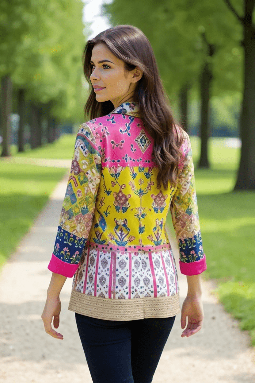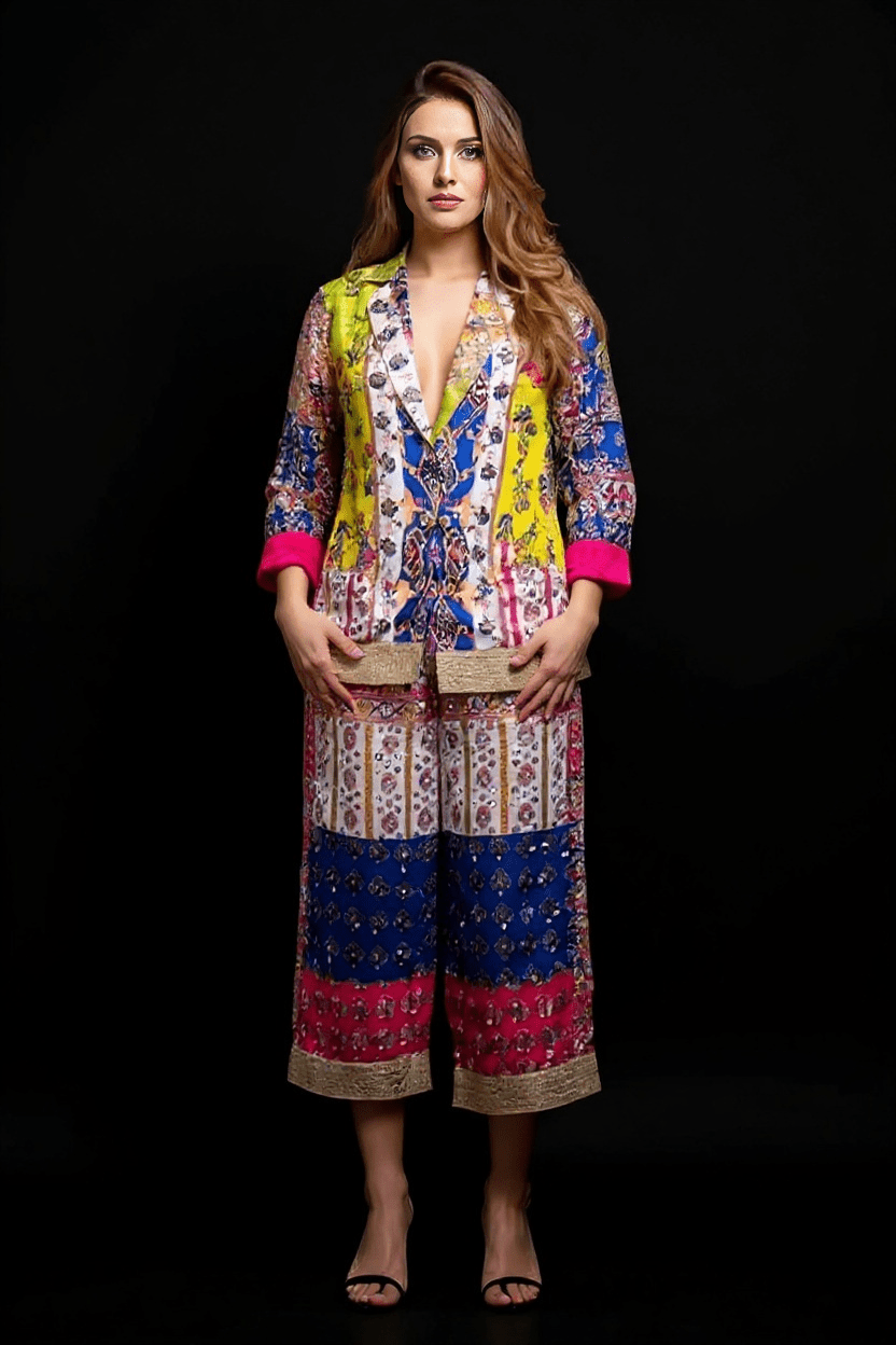 Step into elegance with this handcrafted Boho Fusion Printed Co-Ord Set from Rajni Collection. Featuring a vibrant mix of traditional and contemporary prints, this outfit is designed with a statement jacket and wide-leg pants. The bold color blocks of yellow, pink, and blue are perfectly balanced with intricate floral and ethnic motifs, making it a versatile choice for festive gatherings, cocktail evenings, or destination events. Crafted with premium fabric and finished with golden detailing on the hem, this co-ord set is perfect for the modern woman who loves making a statement.