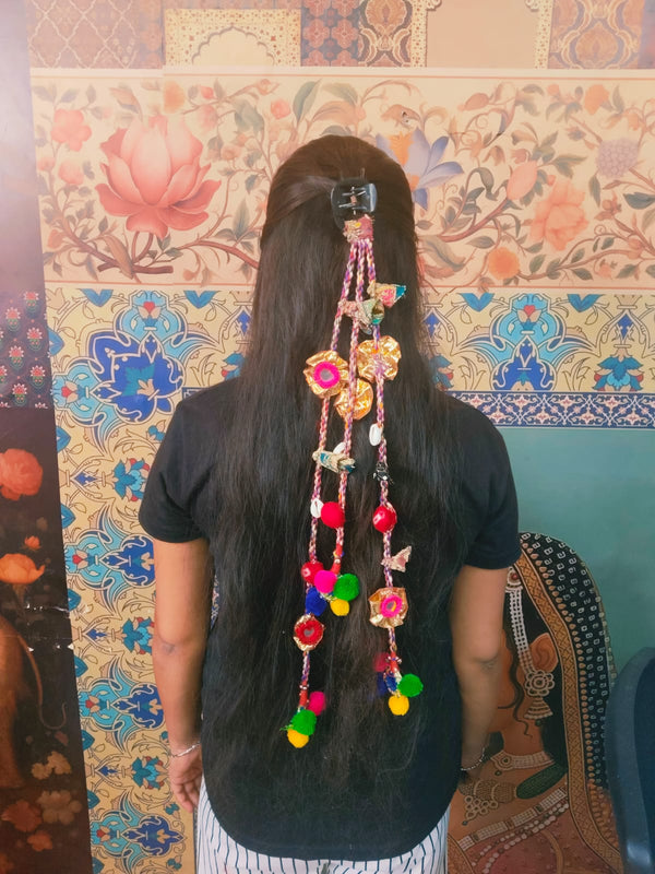 Add a vibrant touch to your festive hairstyle with this handcrafted Rajasthani hair juda accessory. Adorned with colorful pom-poms, shells, beads, and mirror work, it brings the perfect traditional charm for Navratri, Garba nights, weddings, and cultural events. Easy to clip on, lightweight, and designed to complement both Indian and fusion outfits.