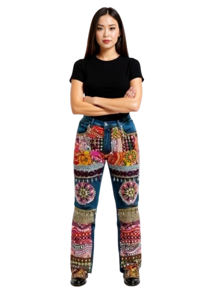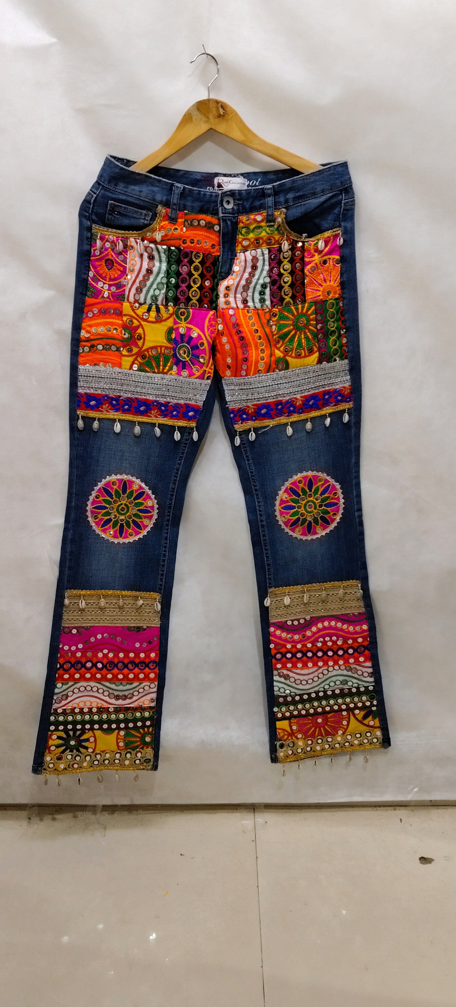 Make a bold statement with our handcrafted Boho Embroidered Denim Pants, designed for the free-spirited fashionista. These one-of-a-kind jeans feature vibrant patchwork, intricate mirror work, traditional thread embroidery, and sequin detailing – giving you a perfect mix of modern edge and ethnic charm. Pair them with a solid top or crop tee for a head-turning fusion look!