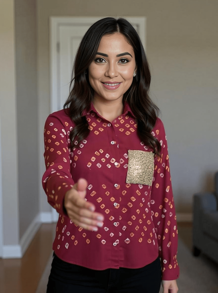 Turn heads with this elegant yet edgy Bandhani print shirt, featuring a rich maroon base adorned with traditional dot patterns and a bold golden hand-embroidered pocket. This fusion piece blends Indian heritage with contemporary tailoring – perfect for casual brunches, office chic, or festive gatherings.