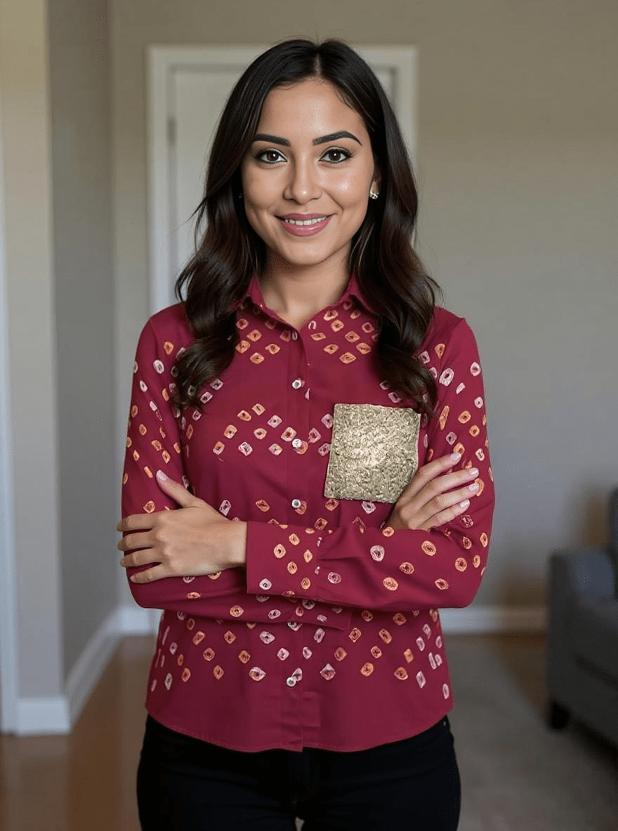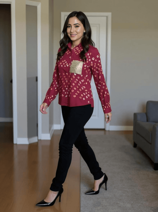 Bandhini Shirt Maroon with Golden Sequin Pocket – Festive Fusion Wear