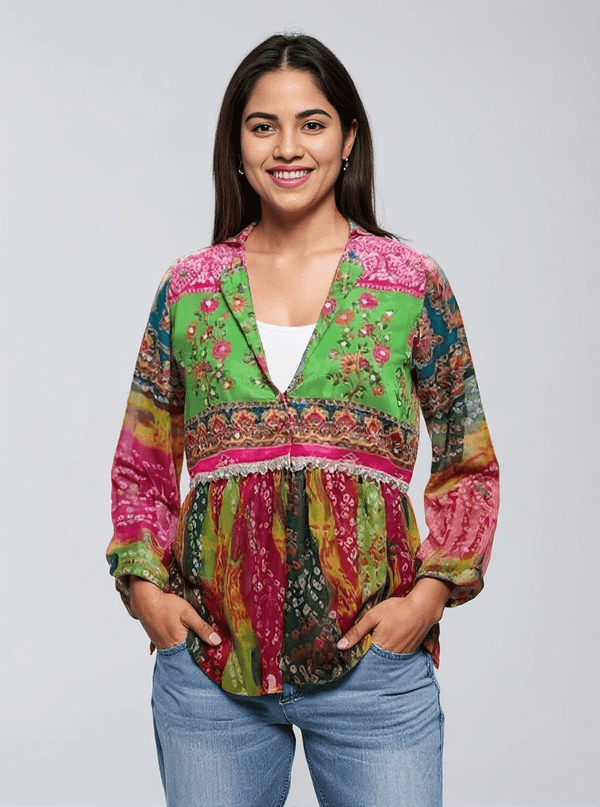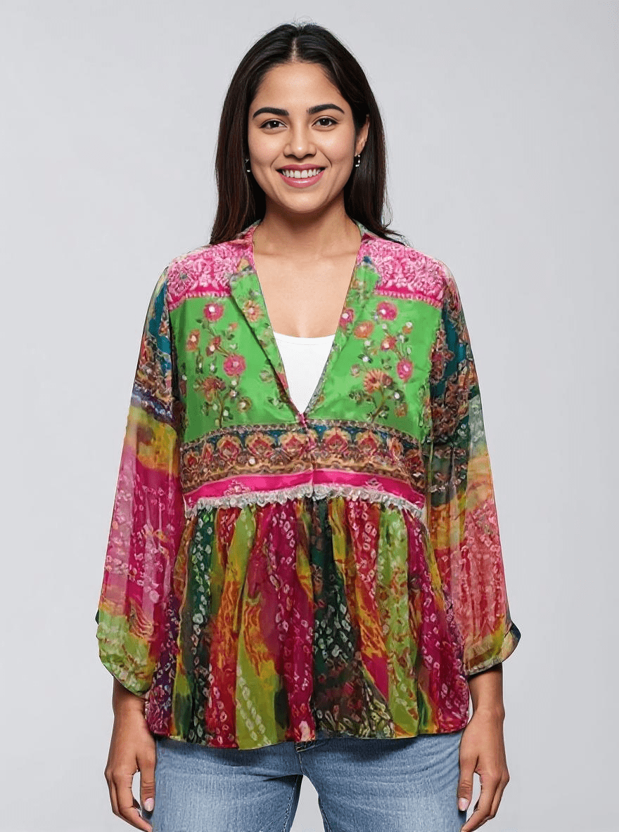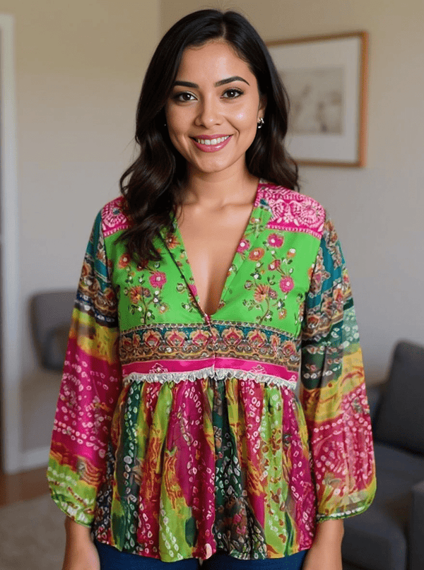 Elevate your boho wardrobe with this vibrant handmade artisan tunic featuring intricate mirror work and multicolor patch design. Carefully crafted by skilled Indian artisans, this lightweight top brings tog