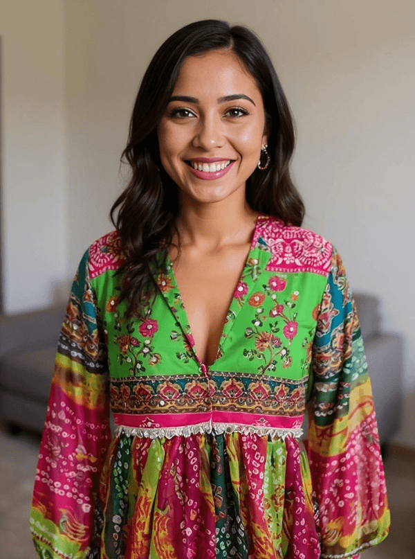 ether traditional craftsmanship and modern silhouette. The flowy fit, vivid hues, and unique fabric panels make it perfect for festive days or casual glam looks.