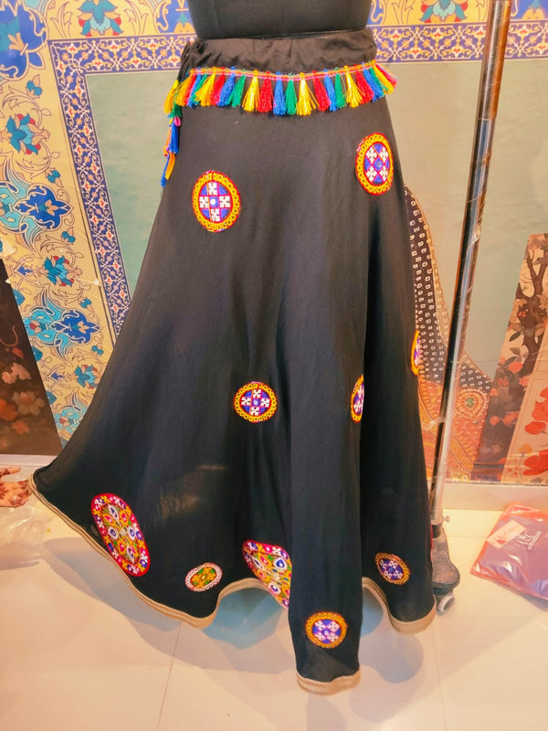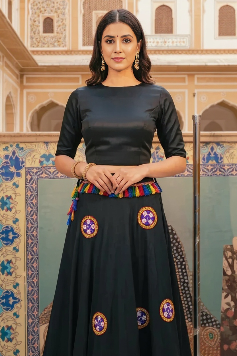 Black Mirror Work Lehenga with Colorful Tassel Belt