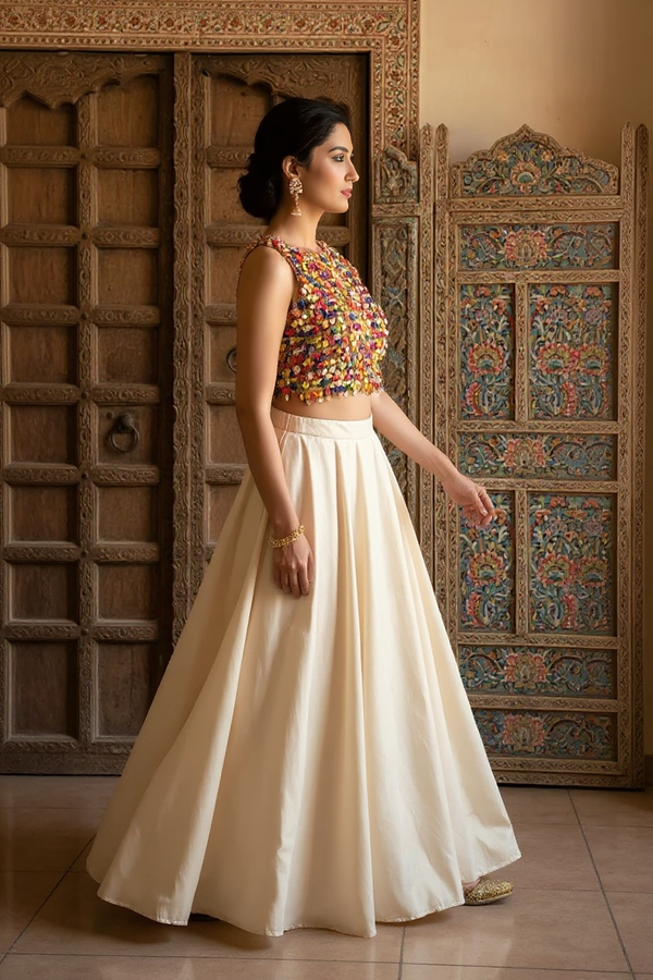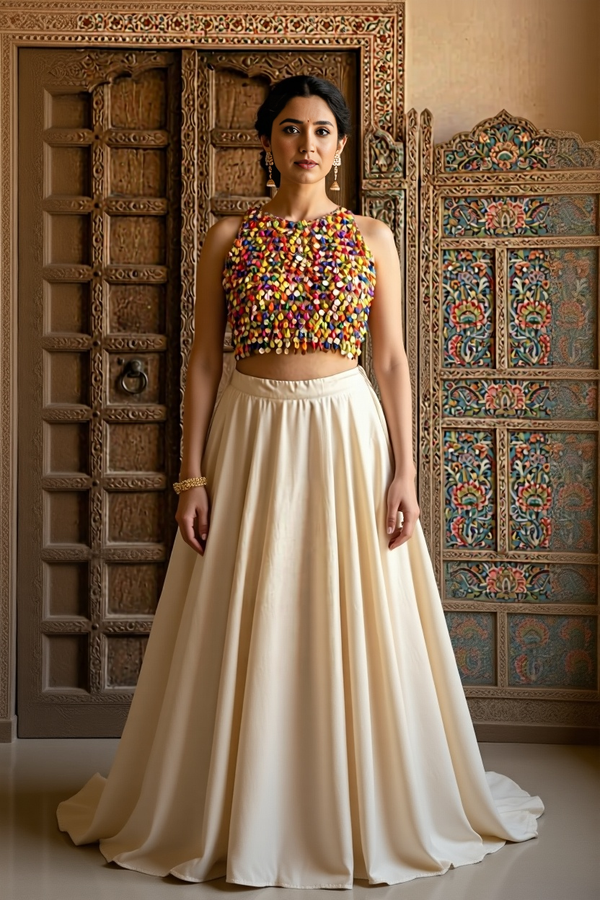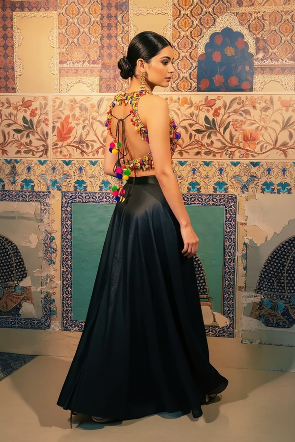 The chic high-neck crop top design blends modern elegance with traditional artistry, making it perfect for Navratri, weddings, sangeet nights, or festive celebrations. Pair it effortlessly with lehengas, skirts, or palazzos to create a bold and graceful statement look.