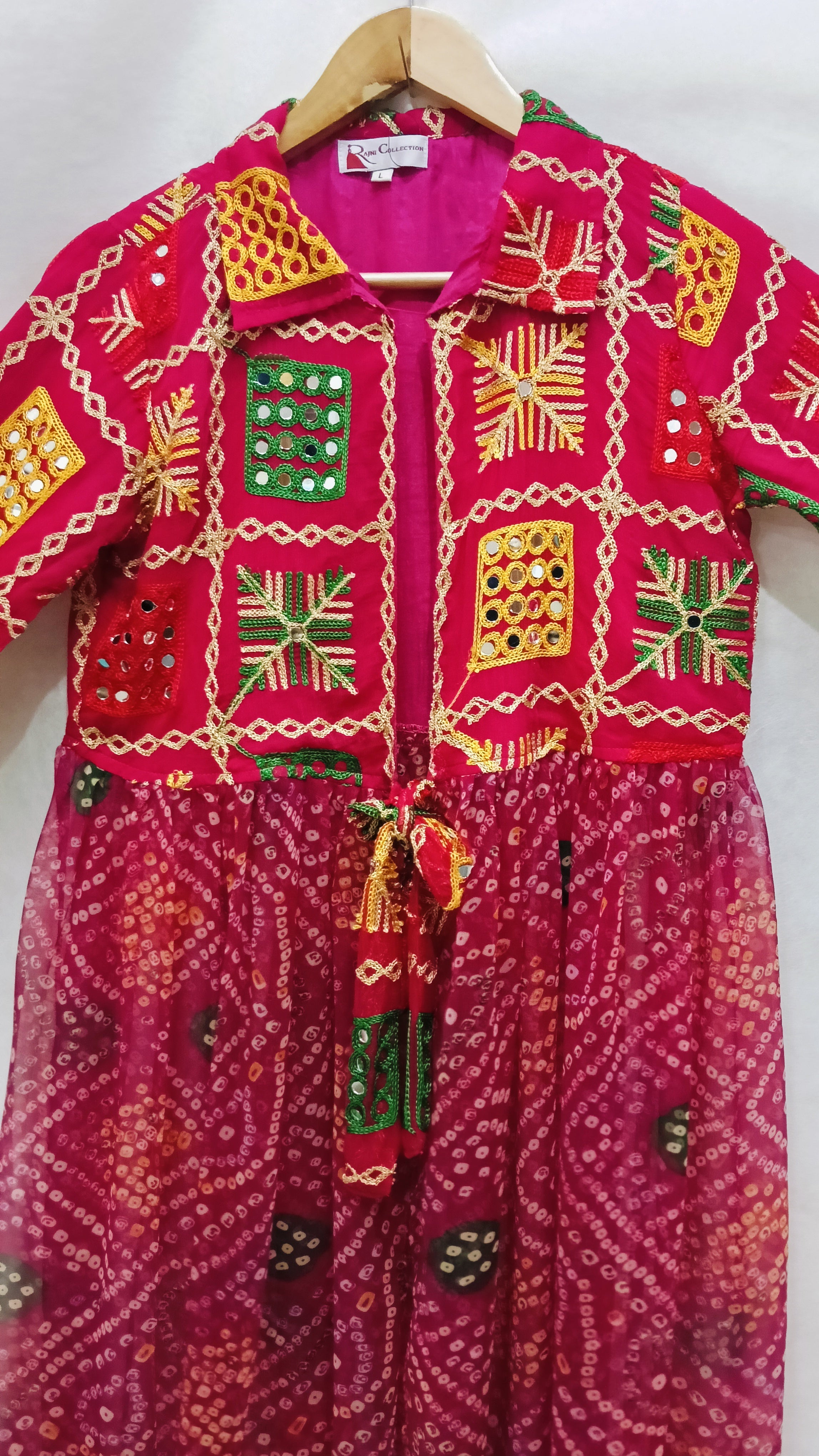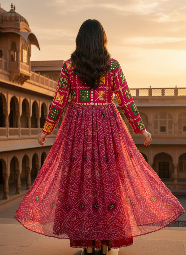 Make a bold festive statement with our Rani Bandhej Phulkari Shrug, crafted with traditional hand embroidery and vibrant mirror work detailing. The deep pink (rani) base in bandhej tie-dye pairs beautifully with colorful phulkari patchwork on the borders and sleeves, giving it a perfect ethnic yet contemporary appeal. Lightweight and flowy, this shrug is ideal for layering over lehengas, dresses, or co-ord sets, making it a versatile pick for Navratri, Garba nights, weddings, and festive occasions.