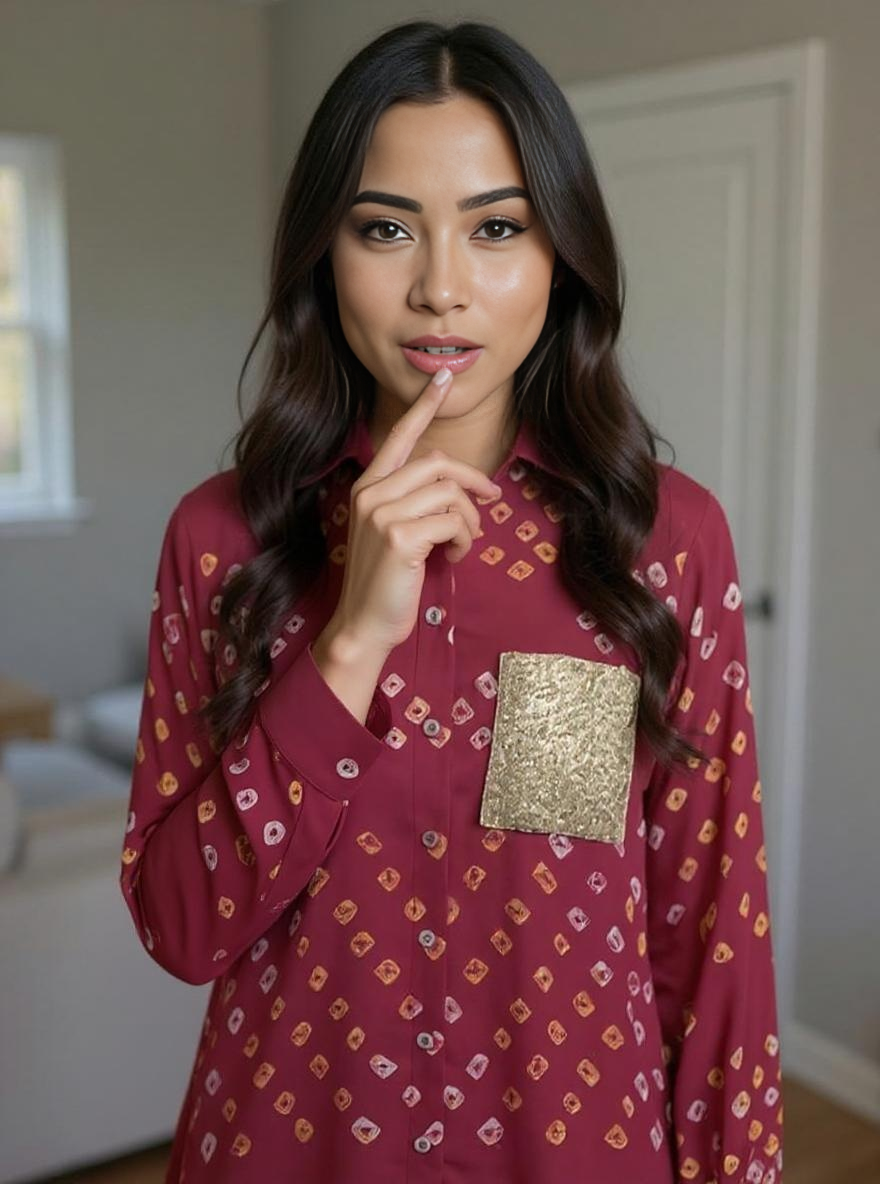 Bandhini Shirt Maroon with Golden Sequin Pocket – Festive Fusion Wear – Rajni Collection