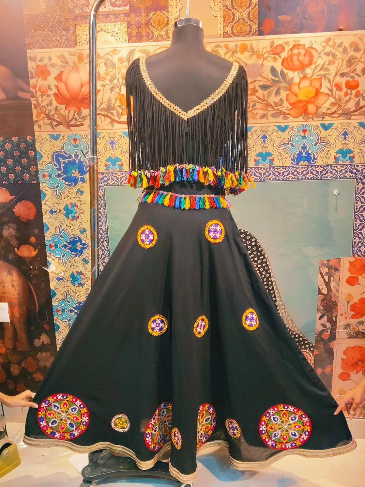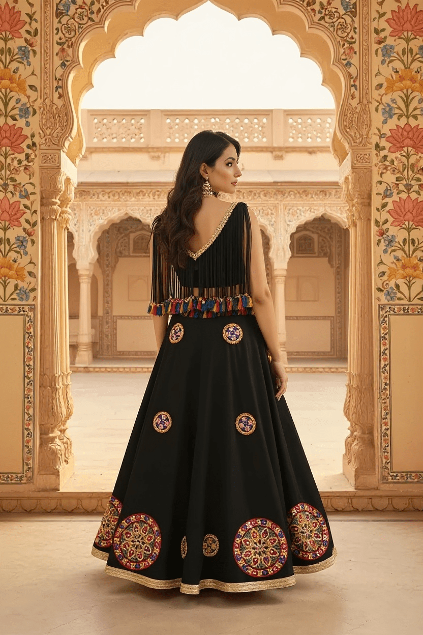 Step into the festive season with this stunning black lehenga set, designed to make you shine at every occasion. The lehenga features intricate mirror work circular motifs along the hem and panels, beautifully highlighted with a golden border for a regal touch. The blouse comes with statement tassel detailing and gold embellishment at the neckline, creating a modern twist on traditional design. A vibrant tassel belt at the waist adds a playful pop of color, making this outfit perfect for Navratri, weddings, sangeet nights, or cultural celebrations.