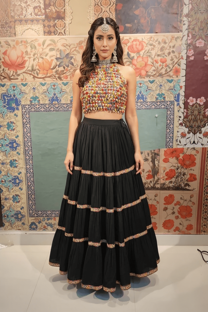 Black Tiered Lehenga with Multicolor Beaded Blouse