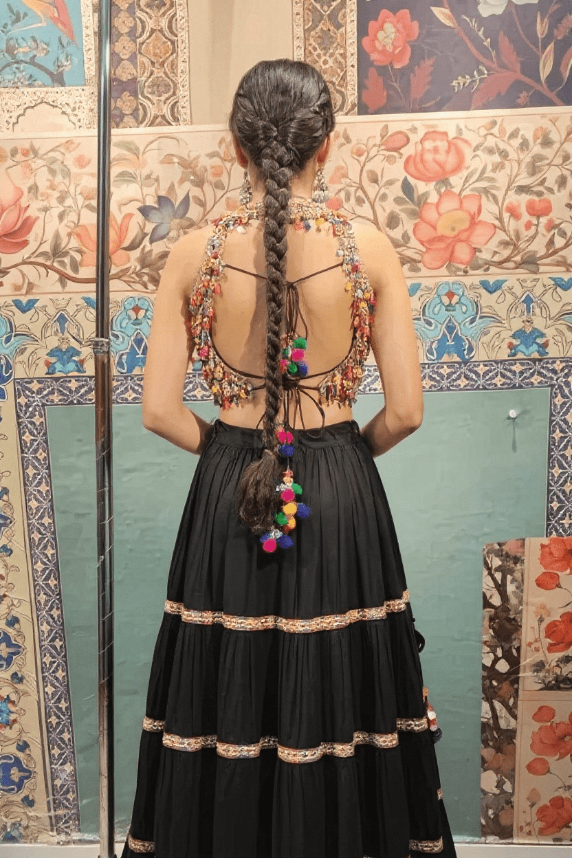 This ensemble is designed for Navratri nights, weddings, sangeet, and festive occasions, offering both comfort and sophistication. The bold black base enhances the vibrant beadwork, making it a unique statement piece for your wardrobe.