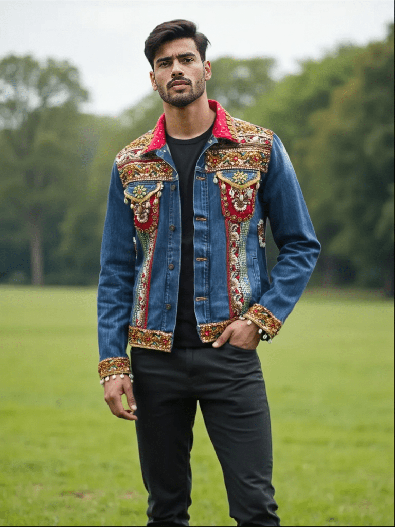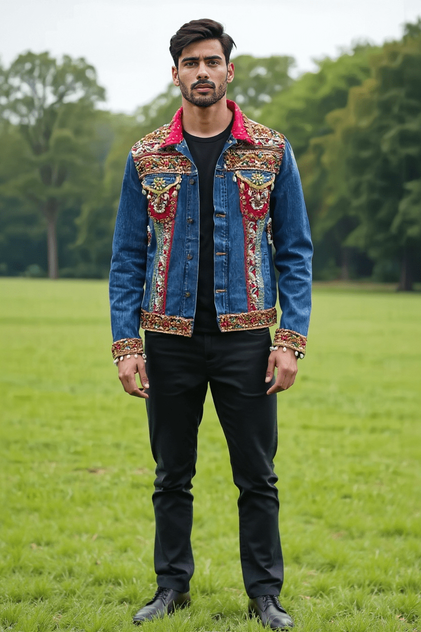 Elevate your wardrobe with this Royal Embellished Denim Jacket, a striking blend of rugged denim and intricate Indian craftsmanship. Adorned with hand embroidery, mirror work, bead accents, and vibrant red patchwork panels, this jacket embodies luxury and cultural heritage in a modern silhouette. Designed for the bold and stylish man who isn’t afraid to stand out.