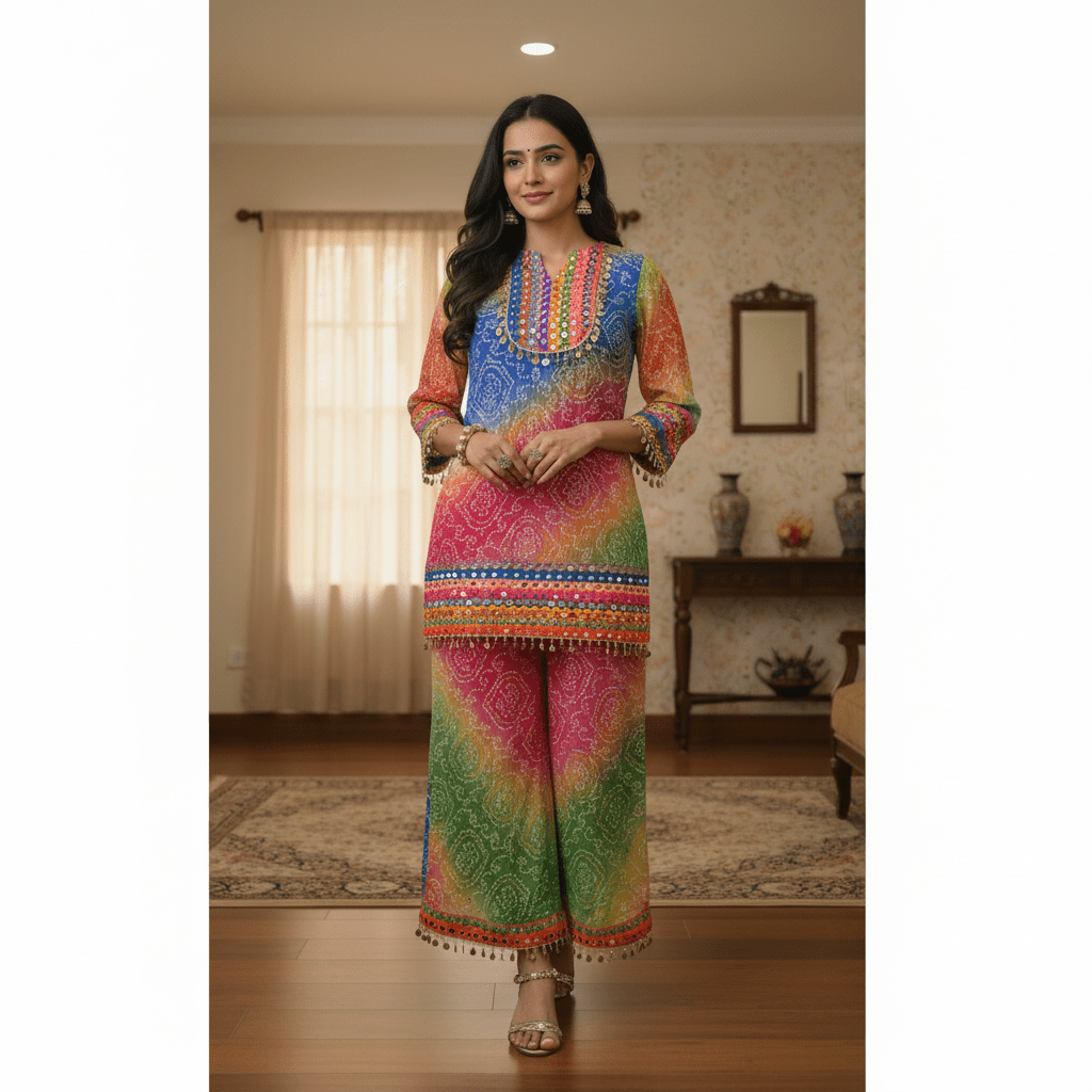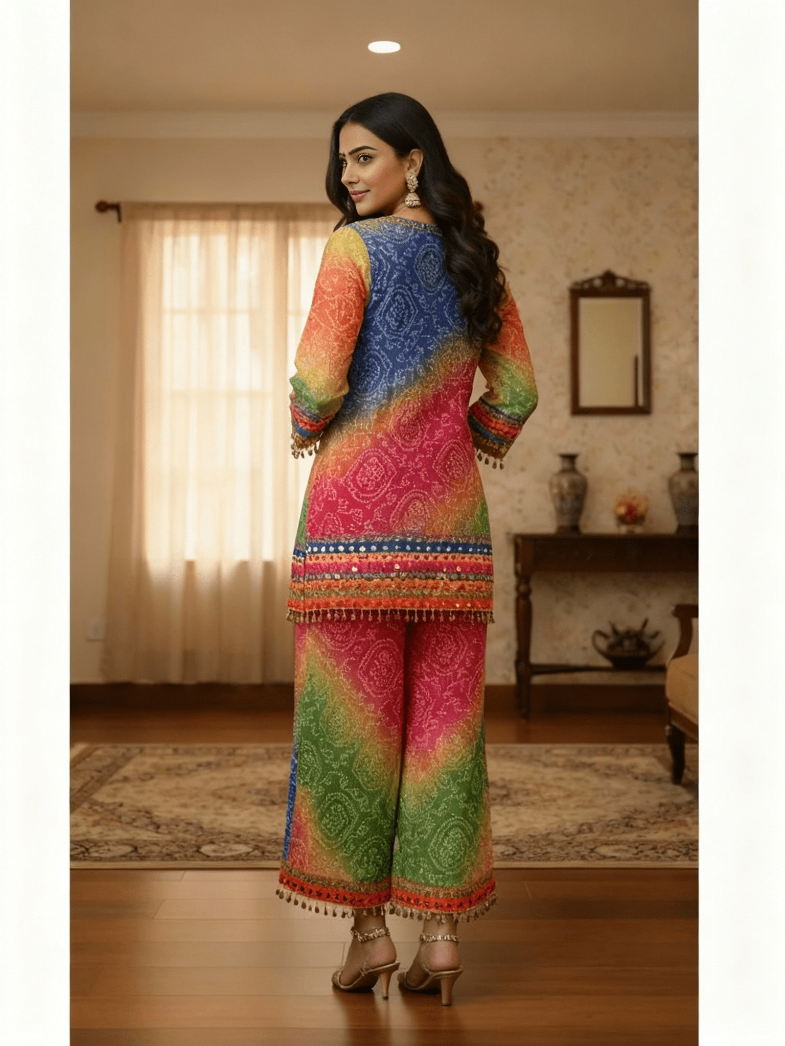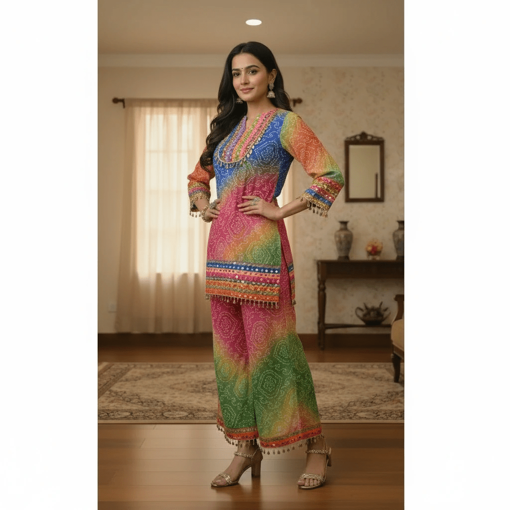 righten up your festive wardrobe with this stunning multicolor Bandhani kurta and palazzo set, crafted with exquisite detailing and rich traditional charm. The vibrant ombré pattern blends hues of blue, pink, green, and yellow, enhanced with intricate mirror embroidery and handcrafted coin lace trims that add a touch of sparkle and movement.