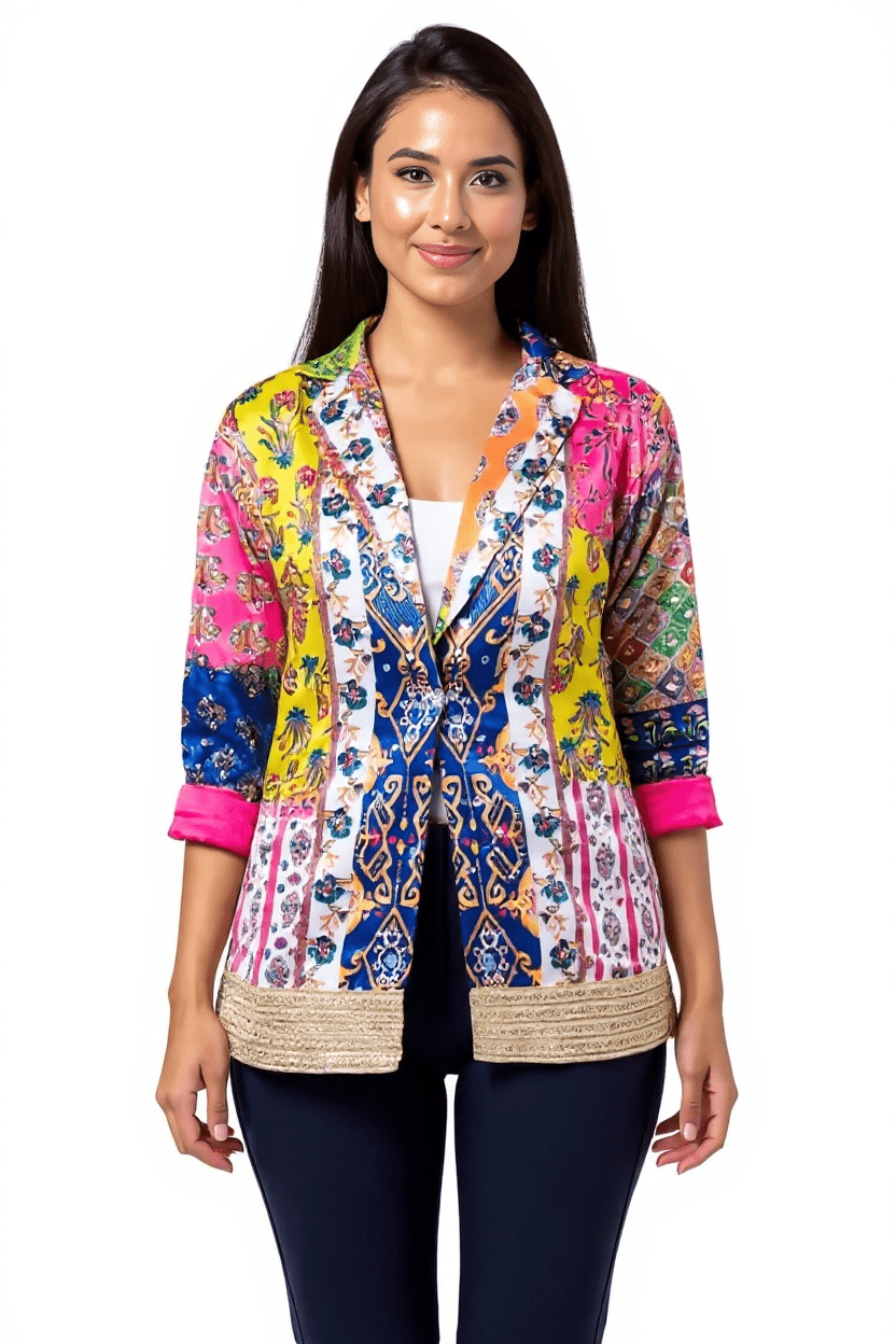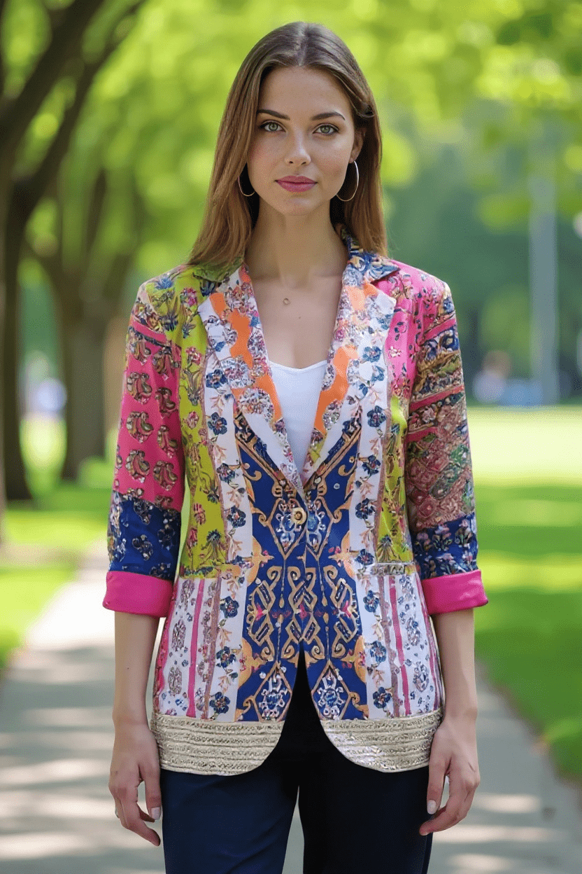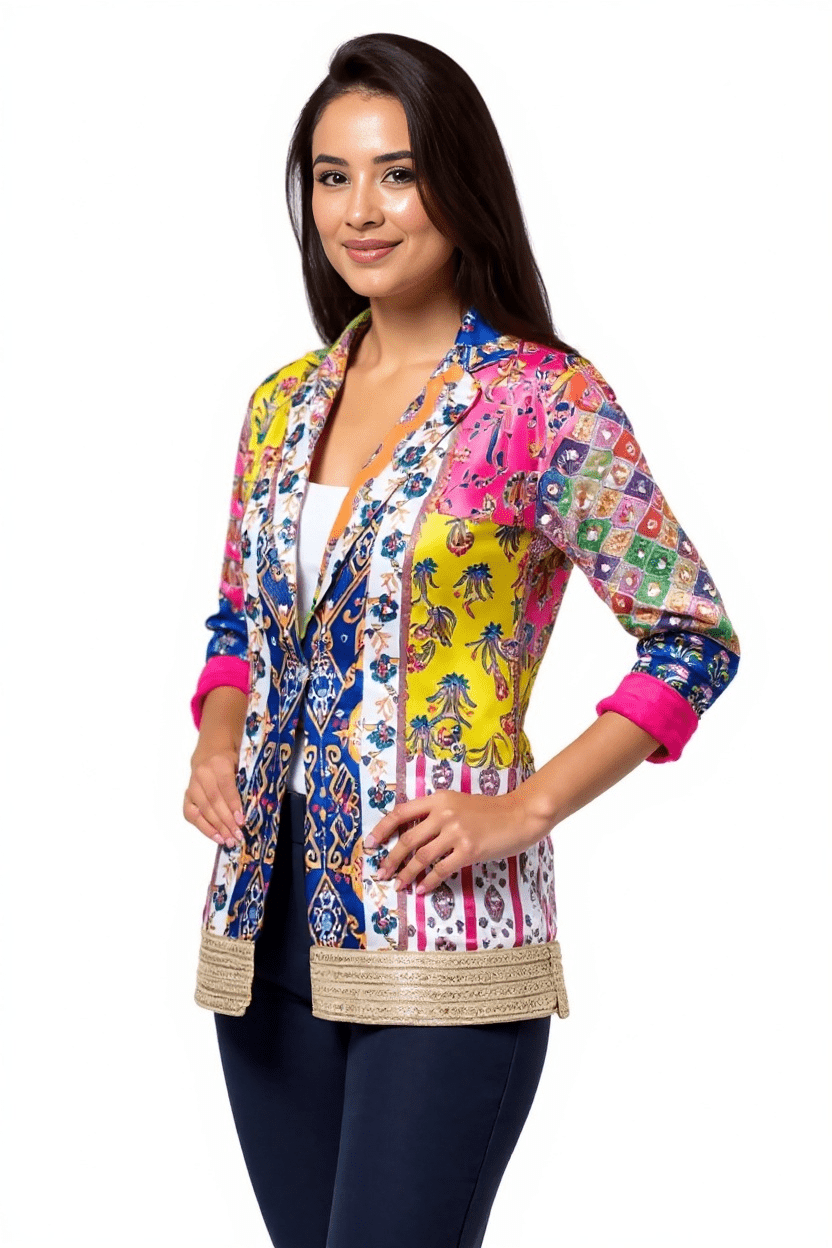 The tailored fit with a single-button closure brings a structured elegance, while the bohemian patchwork design adds a playful, artistic vibe. Perfect for layering over both western and ethnic outfits, it seamlessly blends modern tailoring with traditional craftsmanship.