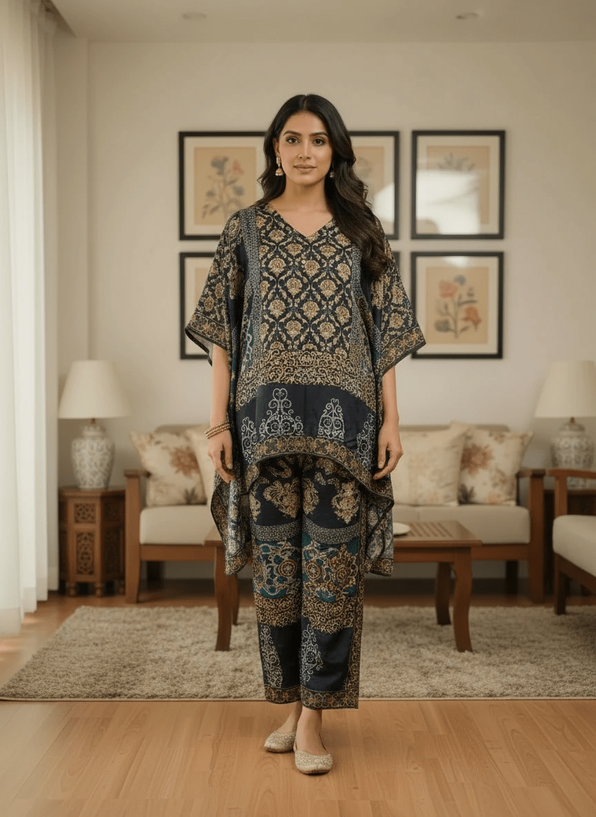 Bring timeless grace and modern sophistication to your wardrobe with this navy blue printed kaftan-style co-ord set. Featuring a relaxed-fit V-neck kaftan top paired with matching printed straight-fit pants, this ensemble showcases intricate motifs inspired by traditional Indian artistry.