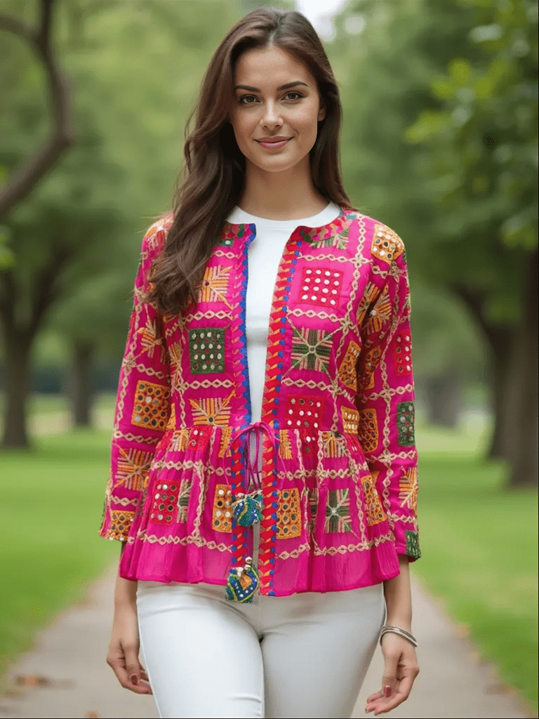Elevate your style with this stunning handcrafted Phulkari embroidered jacket top, featuring intricate mirror work, bold multicolor thread patterns, and playful tassel accents. Perfect for pairing with shorts, denim, or traditional bottoms, this versatile piece brings a burst of ethnic charm to any outfit. Made from soft, breathable fabric, it’s ideal for festive occasions, casual gatherings, or vacation wear.