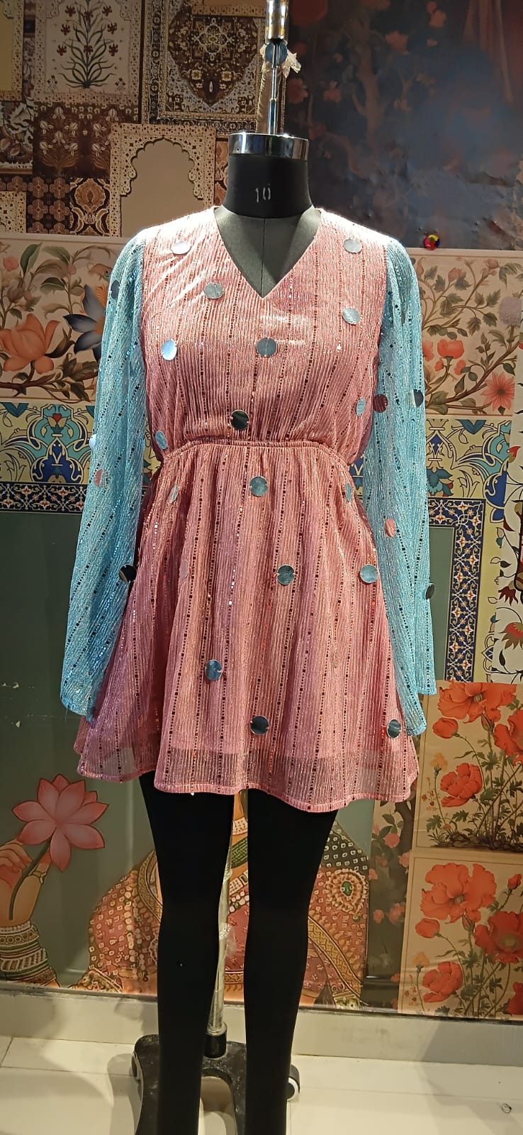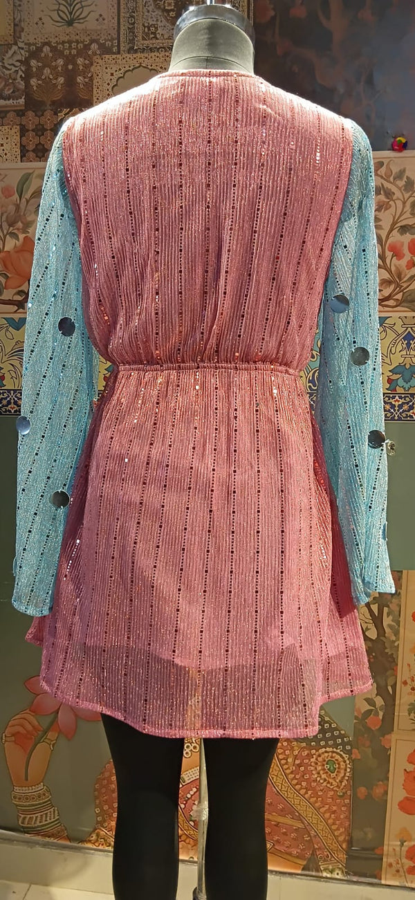 Add a touch of playful elegance to your wardrobe with this pink and blue shimmer tunic, beautifully designed with delicate sequin embellishments that catch the light from every angle. The soft pink body paired with contrasting icy-blue sleeves creates a stunning two-tone look, while the gathered waistline flatters your silhouette effortlessly.